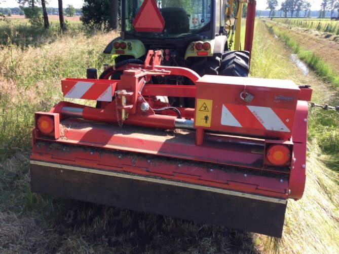 Voor het waterschap zijn er diverse wijzigingen aangebracht aan de klepelmaaier. Zo is de aandrijving verhuisd naar de rechterkant van de machine. Ook is er een trekhaak, gereedschapskist en bak voor de messen gemonteerd. Op de foto staan chauffeurs Wiecher Leideman en Dennis Tuitert tevreden bij hun nieuwe machine.