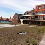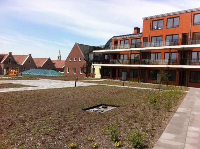 Meervoudig ruimtegebruik in optima forma. Door de aanleg van een Optigroen-daktuin is extra groene leefruimte gecreëerd en wordt de biodiversiteit bevorderd.