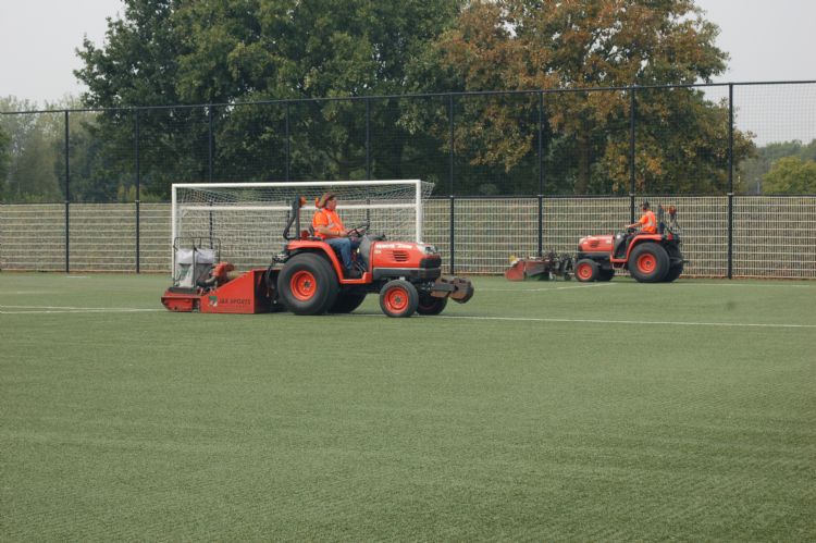 Hendriks en zijn collega Derks zijn er niet vies van om de hand in eigen boezem te steken. Hendriks: ‘Zoals gezegd staat veiligheid voorop. Als daarvoor meer tussentijdse keuringen nodig zijn, of beter onderhoud van onze kant, dan kiezen wij daar onmiddellijk voor.’ Toch staan zij erom bekend dat ze hun onderhoudsploeg vakbekwaam te werk laten gaan en niet bang zijn om advies bij derden in te winnen. Derks: ‘Onze onderhoudsploeg denkt goed na over de werkzaamheden. Rond de aanleg van de tweede generatie velden, vanaf 2014, hebben we besloten om onze wiedeg in de schuur te laten staan. Deze gaat vrij grof te werk. Medewerkers waren bang dat ze daarmee de backing van de nieuwe mat zouden beschadigen. Ook moest je bij het gebruik van de wiedeg daarna nog een keer egaliseren. In plaats daarvan hebben we geïnvesteerd in de Rake Master van AT Machines, die in één werkgang infill kan decompacteren en egaliseren.’