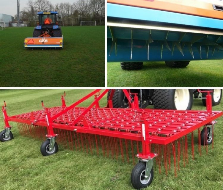 | | De toplaag van de sportvelden intensief bewerken door o.a. het toepassen van topbeluchten (boven) en kriebeleggen (onder) kan helpen om de wormenpopulatie binnen de perken te houden. |