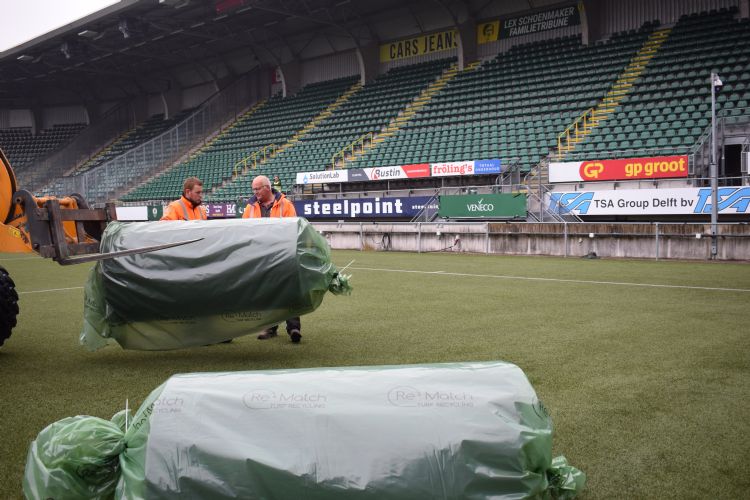 Het inzaaien en inprikken van de nieuwe toplaag werd voorafgegaan door het slopen van de oude constructies. In 2015 verrichtte aannemersbedrijf Heijmans de laatste ingrijpende werkzaamheden aan het veld. Vanaf dat moment bestond de opbouw van Ado uit een zoab-asfaltlaag met daarop een e-layer en daarop weer de kunstgrasmat. Bij de opstart van het project verwijderde AH Vrij al die zaken en toen pas kon er worden begonnen met het echte werk. In de sloopfase werd ook de oude bestaande drainage verwijderd en nieuwe aangelegd op een diepte van 80 cm onder maaiveld. Dit omdat de bestaande drainage niet diep genoeg lag, maar ook omdat met nieuwe drainage alle risico's op fouten uit het verleden kunnen worden vermeden. De oude matten worden ingenomen door Re-Match uit Denemarken en worden naar de fabriek van Re-Match in het Deense Herning vervoerd. Deze matten zullen zeer binnenkort gerecycled worden, ook omdat het stadion een bank terugkrijgt die van de oude kunstgrasmat is gemaakt. Opvallend bij het verwijderen van de matten is dat iedere rol op het veld wordt ingepakt in een sleeve; dit om ieder risico op het lekken van infill buiten het veld te vermijden. Re-Match claimt dat op deze manier wordt voorkomen dat er per veld honderden kilo's infill nodeloos in het milieu terechtkomen. Een groot voordeel is daarnaast dat in de verdere verwerking exact bekend is waar een rol vandaan komt.