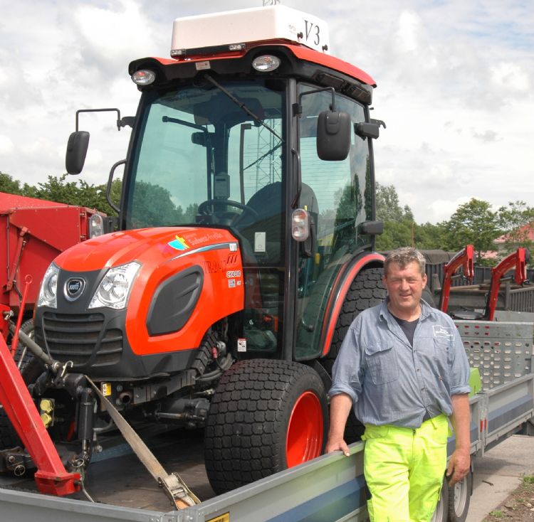 Sybe Postma bij de Kioti CK4010 HST op de aanhanger. Deze compacttractor is vanwege de SBR-infill uitgerust met een luchtdrukcabine.