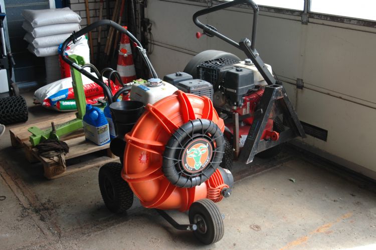 De walk-behindbladblazer waarmee het losgemaakte vuil, mos en algen op een rij geblazen worden.