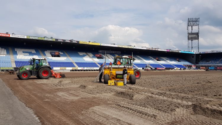 De werkzaamheden in het stadion van PEC moesten in een relatief kort tijdbestek worden uitgevoerd. Eerst werd de oude mat verwijderd en de onderlaag afgevoerd. 'Uiteindelijk kwamen we uit op het drainagezand. Vandaaruit zijn we weer gaan opbouwen', legt Van Weeghel uit. 'We hebben de eigenschappen bekeken en bepaald wat voor toplaag tussen het zand en de natuurgraszode moest komen. Het doel was om een toplaag met bodemleven te ontwikkelen. Omdat de tijd ons parten speelde, konden we hier niet inzaaien. We moesten kiezen voor graszoden en hebben die laten leveren door SIS Pitches.' Onder de nieuwe grasmat ligt nu een compleet nieuw pakket. De grasmat is voorzien van veldverwarming, wat verplicht is voor bvo's met natuurgras, de drainage is verbeterd en er is nieuwe beregening geïnstalleerd door Mölder.