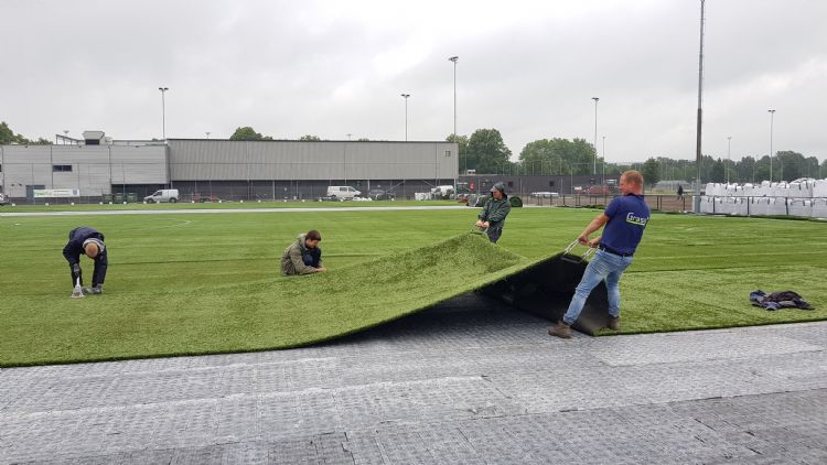 De 'oude' kunstgrasmat wordt helemaal hergebruikt op de nabijgelegen velden