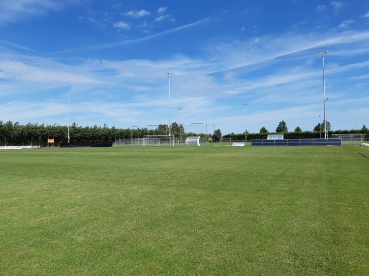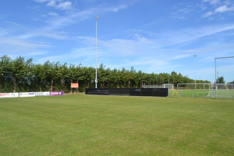 | | De nieuwe boarding. Op de achtergrond de ledlampen van het kunstgrasveld |