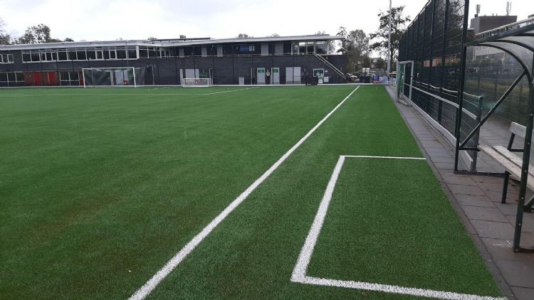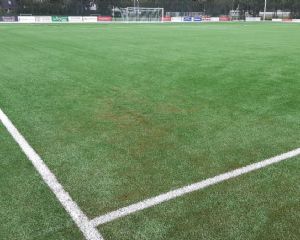 Op onderstaande foto's is het verschil goed te zien. Links het veld van Alliance in Haarlem met de nieuwe mat, rechts een veld in Velsen waar kurk uitgespoeld is.