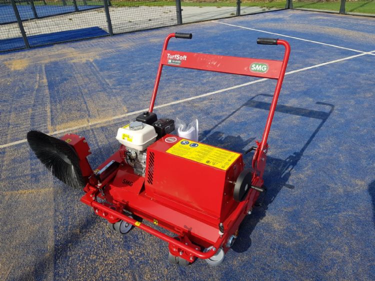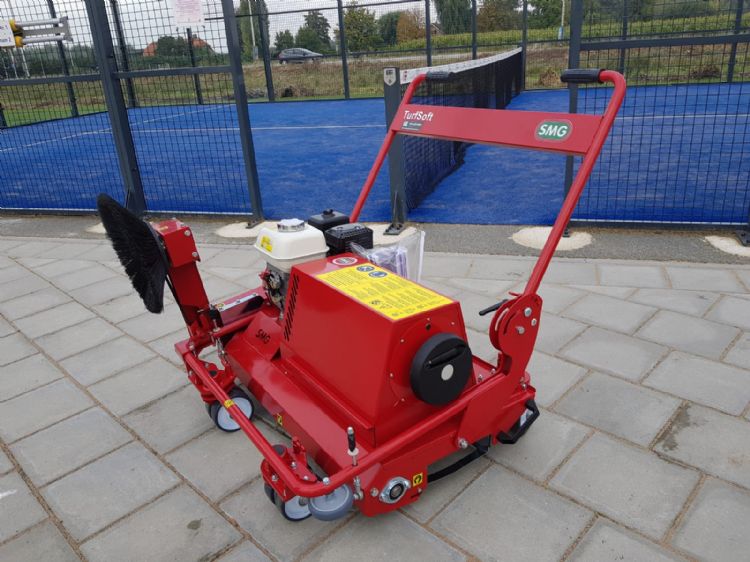 De SMG Turfsoft is natuurlijk geen onbekende machine op kunstgrastennisbanen. Dat deze machine, specifiek de TS2- of de TS3-versie (met zijborstel), favoriet zou worden om ook padelbanen mee te onderhouden, stond in de sterren geschreven. De machine is interessant geprijsd en je kunt er op kleine sportoppervlakken van kunstgras gemakkelijk mee uit de voeten. Dankzij een horizontaal geplaatst kunststof wieltje kun je de machine bijvoorbeeld schadevrij kort langs boardings of muren sturen.