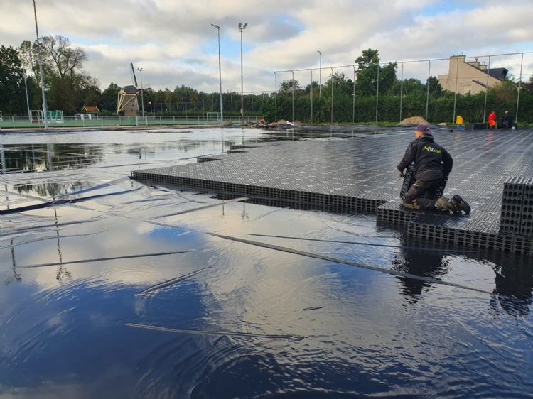 Een sportpark inrichten dat geheel zelfvoorzienend is met water, dat was het doel bij de veldrenovaties op Sportpark Roomburg in Leiden, deze zomer. De velden werden voorzien van een waterbuffer, die hemelwater en beregeningswater opvangt en vasthoudt om jaarrond mee te beregenen. Met de oplevering is een nieuw 'blauw sportpark' een feit.