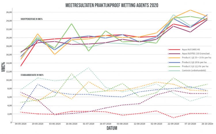 - Hogere bodemvochtbalans met wetting agents. Alle wetting agents zorgen voor een significant hogere bodemvochtbalans ten opzichte van de onbehandelde controleplots. - OARS HS scoort beste op gemiddeld VWC%. Over de gehele testperiode scoort OARS HS gemiddeld het hoogste in de gemeten vochtpercentages. Daarnaast blijven de gemeten vochtpercentages gedurende de hele periode stabiel zonder pieken. Bij onder andere Aqua Premium en Revolution stijgen de vochtpercentages aanzienlijk na iedere toepassing. - OARS HS is erg uniform in VWC%. De spreiding in meetwaarden (hoogste en laagste meting binnen de plots) is bij OARS HS kleiner dan 1%. Dat wil zeggen dat bij een gemeten vochtpercentage van 23% de laagste waarde 22% is en de hoogste 24%. Het bodemvochtpercentage is dus over de gehele testperiode stabiel en wijzigt niet bij een toepassing, na een regenbui of droogteperiode. Stress in de grasplant wordt hierdoor tot een minimum beperkt. - Langere werking van OARS HS. Aangetoond is dat de werkingsduur van OARS HS minimaal 6 weken is, de werkingsduur van alle andere producten is maximaal 4 weken. OARS HS haalt deze duurwerking zelfs bij een dosering van 13 liter per ha (laagste dosering van alle producten). In totaal zijn dus slechts 4 toepassingen noodzakelijk, tegenover 6 bij de andere producten. Een besparing in liters product én arbeidskosten. - OARS HS werkt prima in lagere dosering. 4 toepassingen van 13 liter is totaal slechts 52 liter product. Bij 6 toepassingen van Aquapremium kom je uit op 75 liter en bij 6 toepassingen Revolution kom je op 114 liter product per ha. - Bij nauwkeurig vochtgedrag kan watergebruik met 35% omlaag. Eerdere studies (uitgevoegd door Penn State University) naar de werking van OARS HS, lieten al zien dat nauwkeurig en uniform vochtgedrag kan leiden tot een verlaging van watergebruik tot wel 35%. Dit praktijkonderzoek bevestigt deze bevinding.