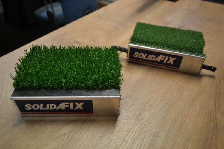 Een nieuwe ontwikkeling van Solidafix is een klemsysteem waarbij de mat wordt ingeklemd met een strip van gerecycled kunstgras in plaats van een nylon touw. Waar er bij het nylon touw een dubbele inklemming wordt toegepast, is er bij de nieuwe methode slechts een enkele inklemming nodig dankzij de breedte van de strip. Hierdoor is de strip van gerecycled kunstgras geschikt voor zowel infill- als non-infill-kunstgrasvelden. Een mooie bijkomstigheid is dat het systeem gerecycled kunstgras bevat: oud kunstgras wordt zo ingezet bij de installatie van een nieuw veld.
