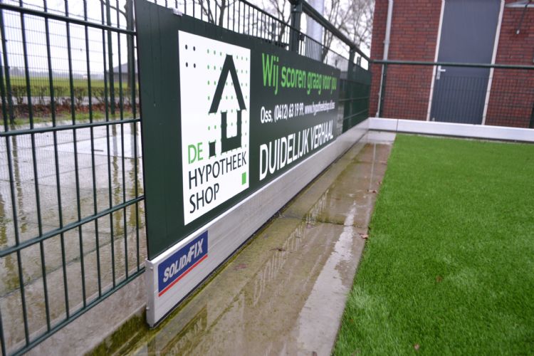 Solidafix maakt de aluminium planken met een hoogte van 8 of 20 cm. Staal is met alle hoogtes te maken. Van Wanrooij: 'Onze stalen plank wordt thermisch verzinkt. Alle bevestigingsmiddelen zijn thermisch verzinkt of van rvs, afhankelijk van de toepassing. Het aluminium profiel wordt geëxtrudeerd; behalve het extrusieprofiel maken we alles zelf.' Ook het aluminium systeem heeft dezelfde rubberstrip aan de onderkant en kan gemonteerd worden op hekwerk of geïnstalleerd worden op reclameborden. Bij de plaatselijke voetbalvereniging in Vinkel, EVVC, heeft Solidafix rond een kunstgrasveld een aantal proefopstellingen gerealiseerd. De eerste velden van 2021 worden binnenkort geplaatst. In Strijen wordt een veld met de aluminium kantplank uitgerust door CSC, in Gilze en Rijen staan er drie velden op de planning door Antea.