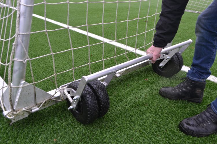 Een mooi voorbeeld van een stukje maatwerk zien we bij EVVC in Vinkel. Solidafix heeft hier een aantal proefopstellingen met kantplanken staan, maar mocht ook de nodige aanpassingen verrichten aan enkele nieuw geleverde doelen. Aan het doel zijn door de leverancier wielen geplaatst. Deze wielen zitten echter te ver van de grond en te ver uit de kant, waardoor de doelen nog steeds lastig te verplaatsen zijn. Solidafix heeft een koppelstuk op het doel gemaakt, waarmee het met een simpele handeling op zijn wielen wordt gezet. Hierdoor is het doel eenvoudig te transporteren.