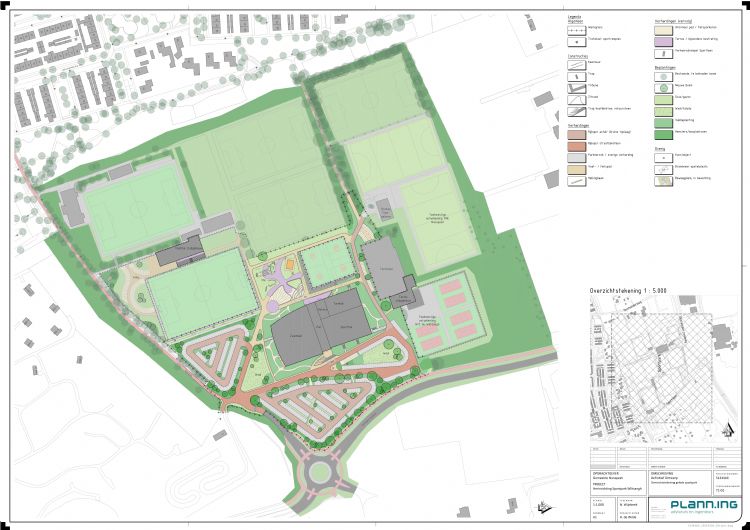 In het nieuwe plan is de sporthal met turnhal en zwembad, ontwerpen door Slangen + Koenis Architecten, de eyecatcher op het sportpark. Er komt een centrale parkeerplaats om het hele park te bedienen. Deze zal bereikbaar zijn vanaf de nieuwe rondweg en niet langer vanuit de woonwijk. Nu de bouw van de sporthal met zwembad gepland staat, verandert ook de situatie van Plann ingenieurs. De Wilde: 'Wij werken eigenlijk op twee fronten. Aan de ene kant kijken we hoe de verenigingen meer kunnen samenwerken en daarnaast hebben wij civieltechnisch alles voorbereid. Slangen + Koenis heeft bij het ontwerp van het gebouw een schetsontwerp van de buitenruimte opgesteld. Wij hebben dit uitgewerkt tot een voorlopig ontwerp en definitief ontwerp. Hiervoor is een programma van eisen opgesteld voor onder andere parkeren, groen, terreinrichting en riolering. Omdat het nieuwe vloerpeil van het gebouw zo'n 2 meter boven het huidige maaiveld komt te liggen, is het engineeren een gedetailleerde opgave. Er zijn veel hoogteverschillen, trapelementen, hellingbanen, tribune-elementen en alles moet voldoen aan de huidige toegankelijkheidsnormen. Neem daarbij nog al het hemelwater dat oppervlakkig wordt afgevoerd naar wadi's en andere infiltratiemogelijkheden, en combineer dat met de vele wensen van de gebruikers van het sportpark. Dan heb je een enorme puzzel te leggen.'