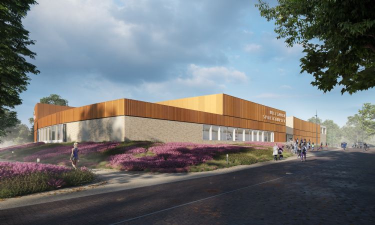 | | De nieuwe hal wordt de blikvanger op het sportcomplex. Ontwerp: Slangen + Koenis Architecten. Visualisatie: DMOO |