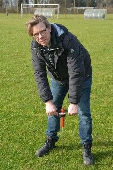 'In Meppel hebben we in 2016/2017 voor het laatst tegen onkruiden gespoten. In die periode zijn we op alle velden overgeschakeld van minerale naar 100 procent organische meststoffen. De omschakeling zorgde voor stress bij het gras en daardoor voor meer onkruidgroei. Hoewel de meststoffen vrij prijzig zijn en we in het begin extra moesten strooien, hebben we wel doorgezet. De bodem is nu op orde en de onkruidgroei op de wedstrijdvelden is nu zeer beperkt. Daar zijn we erg tevreden over. Op basis van grondonderzoek maken we samen met de leverancier per veld een bemestingsplan met drie giften per jaar. We strooien zoveel mogelijk vlak voor een weersomslag, zodat de meststoffen direct actief worden. Bij gebruik van organische meststoffen is een gezond, stabiel bodemleven essentieel. Dit vraagt voldoende lucht en minimaal 3,5 procent organische stof. Voor onze sportvelden is dit de streefwaarde, maar sommige velden hebben iets meer organische stof nodig. De luchttoevoer voor graswortels en bodemleven bereiken we het liefst met een goede bodemstructuur; we beluchten alleen als het nodig is. Dat bepalen we per veld met de penetrometer. Zolang de indringingsweerstand tot 15 cm niet hoger wordt dan ca. 20 bar, is beluchten niet nodig. Dieper in de bodem mogen de waarden wel iets oplopen. Op de trainingsvelden groeien op de minder bespeelde plekken wat meer onkruiden. Bij enkele trainingsvelden hebben we ballenvangers aan de lange zijde geplaatst, zodat de velden overdwars ook gebruikt kunnen worden. Het bestrijden van onkruiden doen we handmatige met Fiskars-onkruidtrekkers. Hiermee kun je ook penwortels vrijwel volledig uit de grond trekken zonder bukken en met weinig schade aan de grasmat. Door regelmatig speelschade en schade door mollen te herstellen, proberen we de vestiging van onkruiden te voorkomen. Afgelopen augustus en september hadden we aanzienlijke schade door engerlingen van de sallandkever. De schade was vrij groot omdat de engerlingen vooral aan de wortels dicht onder het oppervlak vraten. Vanwege de droogte in de zomer hebben we de velden regelmatig beregend. Ik denk dat dieper in de toplaag de grond te droog was. We hebben de engerlingen bestreden door met een aangepaste doorzaaimachine aaltjes in de grond te brengen. Omdat ik aan het begin van de competitie niet zo blij ben met de 2 cm diepe gleuven in de grasmat, wil ik de volgende keer een spaakwielbemester gebruiken.'