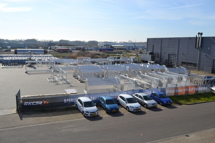 Op het buitenterrein heeft SKOR een grote voorraad doelen en dug-outs staan: meer dan duizend in totaal. Een deel hiervan is klaar om te worden uitgeleverd, maar veel doelen zijn nog niet af omdat ze een modulaire opbouw hebben. Mocht er een bestelling binnenkomen, dan is het doel snel af te maken. In het hoogseizoen is dat ook nodig, legt Jonkman uit. 'In de zomer komt het regelmatig voor dat klanten ons bellen en de volgende dag iets nodig hebben. Dan regelen we dat gewoon. Wij zitten als leverancier van doelen en dug-outs natuurlijk vaak aan het einde van het traject. Het is allemaal just in time.'