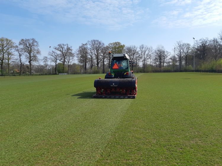 Minimaal één keer per maand gaat het team met de wiedeg over de velden. Ook vlak voor het maaien wordt deze bewerking gedaan. De wiedeg zet het gras en onkruid rechtop, waarna dit door de maaier afgekopt wordt. In Dalfsen worden de velden standaard op 3 cm hoogte gemaaid. Korter maait Meijer niet, behalve bij groot onderhoud. 'Als je het veld heel kort maait, wordt de ondergrond warmer. De natuur wil daar dan wat mee doen en probeert de ondergrond te bedekken, bijvoorbeeld met ongewenste kruiden. Wij denken dat we heel veel kunnen sturen, maar van de natuur gaan we het niet winnen. Dus moeten we de grasmat een handje helpen door het veld bedekt te laten. De zon zal er dan niet rechtstreeks op branden, waardoor je een veel beter veld krijgt.' Die filosofie past hij ook toe bij het nieuwe hybrideveld dat sinds vorig jaar bij vv Hoonhorst ligt. 'Bij hybridevelden had je altijd de discussie over kort maaien. Wij doen dat niet en houden er een pak gras op. Zou je dan niets aan de vezels hebben? Jawel, want die houden de ondergrond in stand.'