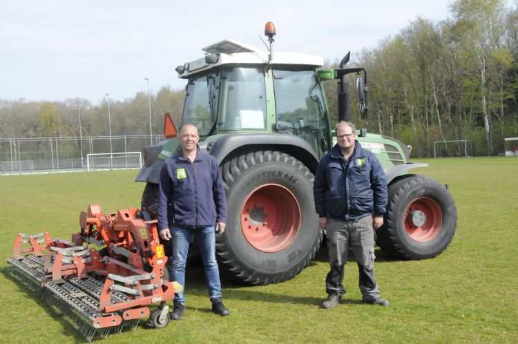 Ik sta met Stefan en Eddie van der Stappen op het veld van het complex in Maliskamp, dat mooi groen en vitaal oogt. Van der Stappen: 'In normale jaren is het beter. We hebben nu door corona veel te weinig gespeeld. Eigenlijk moet een kudde senioren het veld eens goed op zijn donder geven, zodat de mat open blijft en het straatgras een tik krijgt.' Dat laatste doet Stefan met zijn Fendt overigens heel succesvol. De Terra Rake wordt nog een tikje strakker gedraaid en Stefan trekt een paar baantjes. Het effect is overduidelijk. Heel veel oppervlakkig straatgras komt los en er is meer plaats voor de goede grassen. Van der Stappen: 'Wat helpt, is dat het nu redelijk droog is. Het straatgras gaat in stress. Mijn buurman liet op zijn gazon automatische beregening installeren. Hartstikke makkelijk, maar dan wordt er al snel te veel beregend en stimuleer je de onkruidgrassen. Diezelfde reflex zie je bij clubs. Daar wordt 's ochtends bijna automatisch de beregening aangezet en als je pech hebt, zet de volgende vrijwilliger die 's middags opnieuw aan. De gemeente Den Bosch is een paar jaren geleden fors uitgebreid en wij hebben er een aantal complexen bij gekregen. Het eerste wat ik gedaan heb, is van al die complexen de sleutel van de beregening innemen. Voor een club is het vaak toch te verleidelijk om steeds maar de pomp aan te zetten. In de gemeente Den Bosch regelen wij de beregening in plaats van de clubs.'