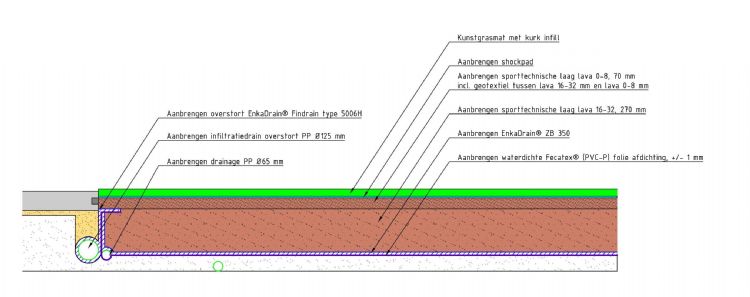 Een klimaatadaptief veld met waterberging is op een aantal manieren te realiseren. Bij dit project werd niet gekozen voor een krattensysteem, zoals in Amsterdam, of een grauwacke- of Waber-systeem. Van Schaik: 'Een krattensysteem is mooi, maar je moet er wel een heel vlakke basis voor hebben. Het is vrij kwetsbaar.' Gras Advies ging in het voortraject in overleg met producent Low & Bonar om een alternatief idee uit te werken. Avéres: 'Wij hadden het idee om een soort waterbergende badkuip te bouwen onder het veld. Bij andere systemen is het de waterberging die infiltreert; in dit systeem is waterdichte folie als een soort badkuip in het cunet gelegd. Daarop is vervolgens een EnkaDrain ZB 350 aangebracht, die een vierledige functie heeft: als filter, als waterbuffering, voor de bescherming van de waterdichte folie en voor de afvoer van overtollig water. De waterbergende laag bestaat uit 270 mm lava 16/32, met daarop een geotextiel en een sporttechnische laag van 70 mm lava 0/8.'