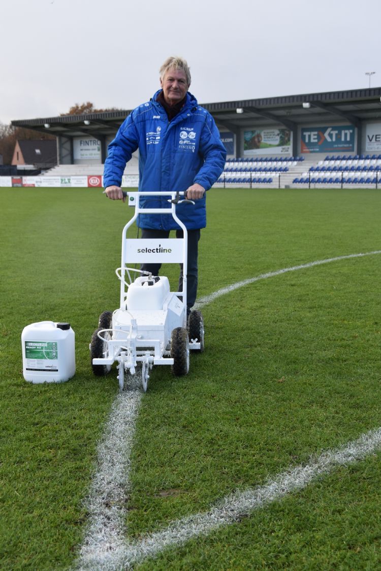 De sfeer bij het interview is zeer gemoedelijk en representatief voor de club, aldus Storms. Tijdens het bezoek meldt ook Dimitri Daeseleire zich, de accountmanager van Selectline voor België. Hij is het aanspreekpunt voor de fieldmanagers, of groundsmen, zoals onze zuiderburen hen noemen. Daeseleire is ook de contactpersoon voor de mannen aan tafel en spreekt hun taal. Gaande het gesprek wordt duidelijk dat het gebruik van Selectline Ready Fit en de relatie met Daeseleire in goede aarde vallen. Daeseleire verduidelijkt dat Selectline als producent zowel de R&D als de productie en de kwaliteitscontrole van de belijningsproducten zelf in huis heeft. De distributie van de producten is echter uitbesteed. In Nederland en België gaat dat via de dealers Scheepers Sport, Amo Sport, Rofraline en Supaturf: 'Ik ondersteun deze dealers, maar in België kunnen gemeenten en clubs ook rechtstreeks bij mij terecht voor persoonlijke service en advies. We zijn sterk aan het groeien op de Europese markt. Daarbij kennen we aan de persoonlijke relatie met onze partners een sleutelpositie toe. Wij zien belijners, groundsmen en terreinknechten als enorm belangrijke mensen binnen clubs; zij zorgen er elke week weer voor dat iedereen kan spelen!'