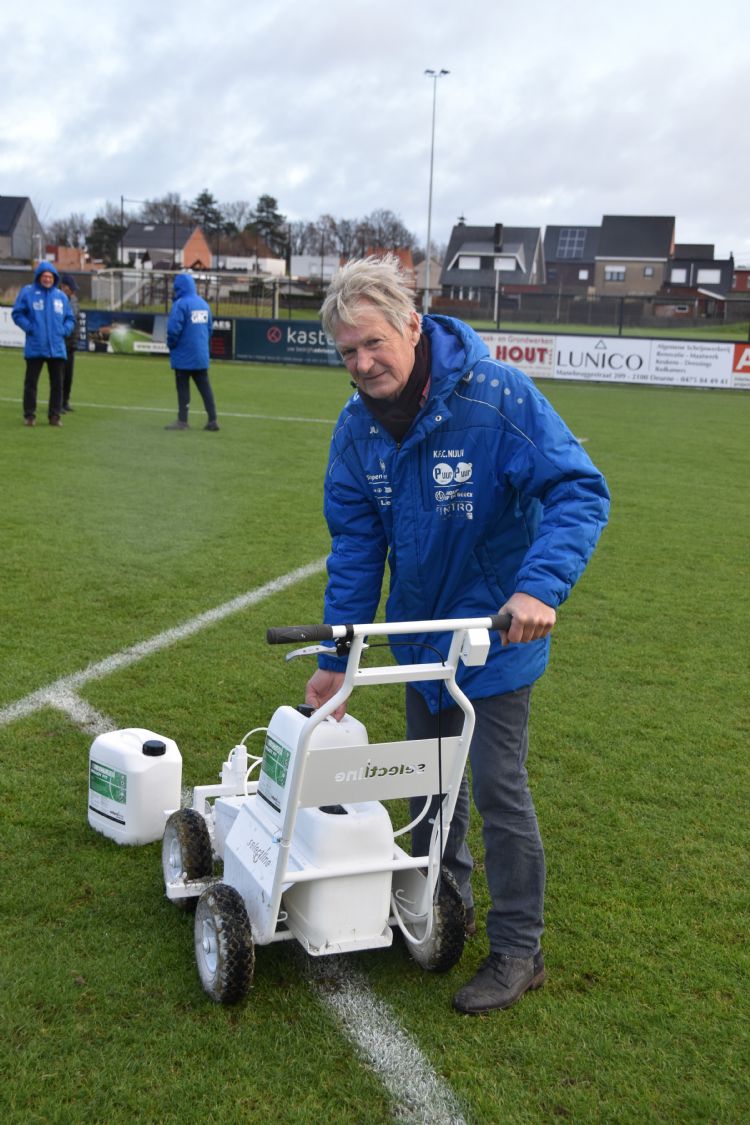 De ervaring bij KFC Nijlen is dat scheidsrechters zeer kritisch zijn op de bespeelbaarheid. Een leuke anekdote gaat over een scheidsrechter die met het reglement in de hand een veld dreigde af te keuren. De vrijwilligers hadden ten gerieve van de goalkeeper een korte witte lijn midden op de doellijn aangebracht. 'Meestal beschadigt een goalkeeper de zode even om zo het midden van het doel te markeren. We wilden hem helpen, ook uit eigen belang. Maar uiteindelijk moesten we de witte streep verwijderen met een borstel en water. Hierover stond inderdaad iets in het reglement', lacht Jan Storms. 'Het is me ook al eens overkomen dat een scheidsrechter op zijn strepen ging staan en het veld een uur voor aanvang van de wedstrijd nog een keer liet maaien. In mijn nette pak! Maar ze zijn soms ook kritisch op de belijning.' En laat dat nu juist de specialiteit van Storms zijn. Dat is ook reden dat hij de lijnen van het hoofdveld keurig wit houdt. Hij neemt de gelegenheid waar om te vertellen hoe ze bij aanvang van het seizoen steeds met lange koorden en markeringspunten en door voortdurend checken de lijnen weer aanbrengen. 'Met drie personen zijn we daarmee per speelveld circa drie uur bezig. Als het belijningsproduct eenmaal is aangebracht, volg je de daaropvolgende keer de lijn als deze nog zichtbaar is. We belijnen dan dus over de bestaande lijnen heen. In de zomer, als het gras snel groeit en we wekelijks driemaal moeten maaien, is na de tweede keer maaien die belijning bijna niet meer zichtbaar. Teveel product is dan al verdwenen. Als lijnentrekker heb je duidelijk te maken met de uitgroei. Ben je te laat, dan moet je alle lijnen met een koord opnieuw uitzetten en controleren, wat weer veel tijd kost. Ook de snelheid waarmee je rijdt als je het product aanbrengt, moet je als lijnentrekker goed aanvoelen. Een belijningsproduct moet je altijd aanbrengen op zo droog mogelijk gras. Dat geeft de beste hechting.'