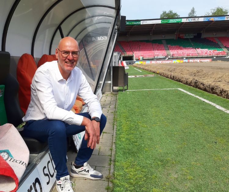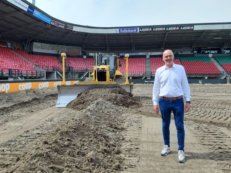 Door zijn opleiding en ervaring heeft Wolbrink zowel de cultuurtechnische als civieltechnische aspecten van sportvelden onder de knie. Op zijn vakgebied is hij bovendien een echte teamspeler. 'Ik geniet enorm van de samenwerking met de opdrachtgever, maar ook met de onderhoudsmensen op het veld, de trekkerschauffeur, de machinebestuurder.' Geen detail ontgaat hem. Wolbrink wijst naar de ondergrond: 'De toplaag is eraf gehaald en gezeefd, omdat er veel grote stenen in zaten. Daarna wordt het veld opnieuw opgebouwd.' Buiten het stadion coördineert Wolbrink het hergebruik van een afgeschraapte toplaag die vrijkwam bij de aanleg van een kunstgrasveld. Hij wijst naar een plaats achter een rij bomen: 'We gaan de grond hergebruiken voor het hybride veld daarginds.'