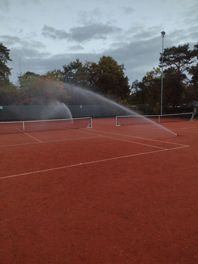 De sproeiers op de nieuwe Top Clay-banen, geplaatst door Beregening Service Nederland