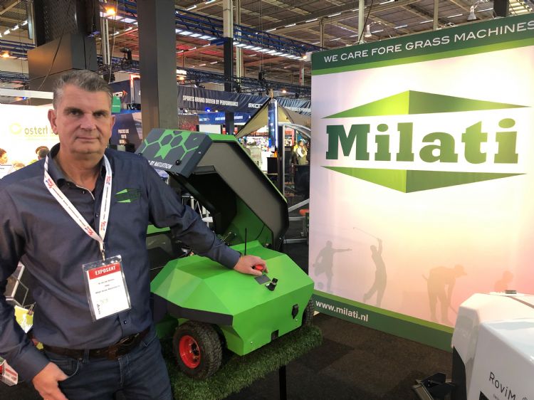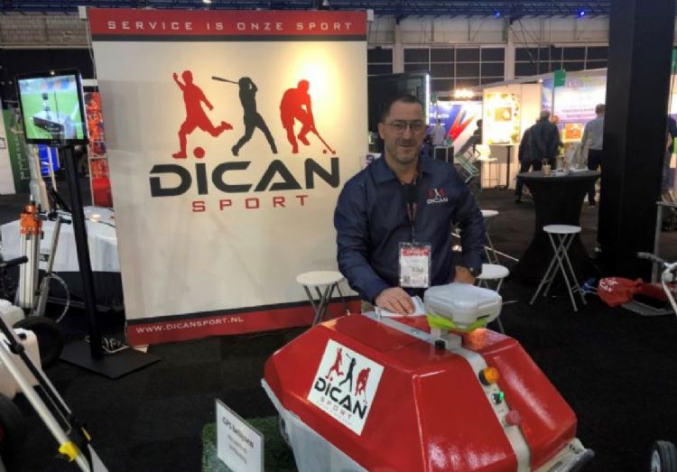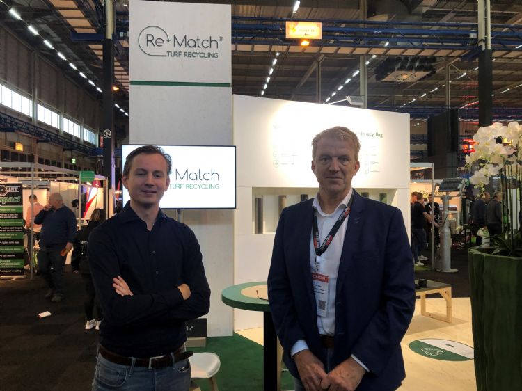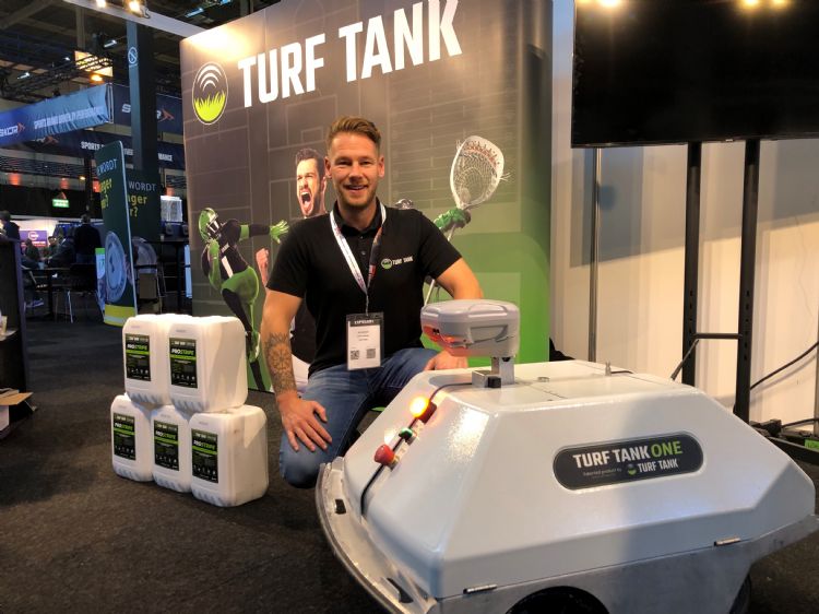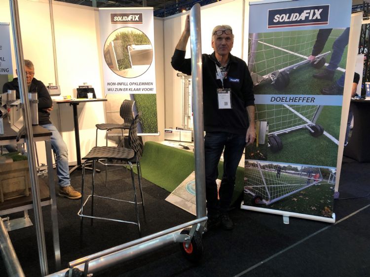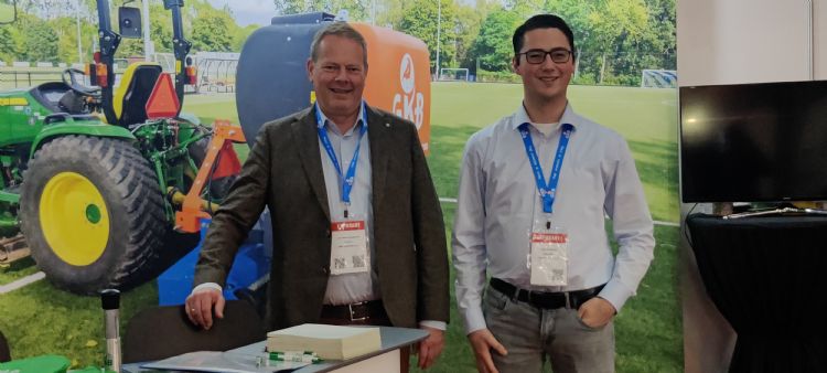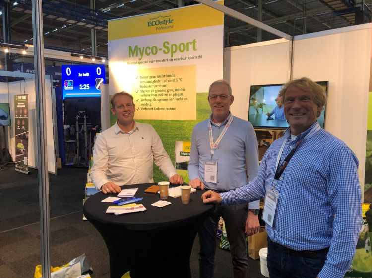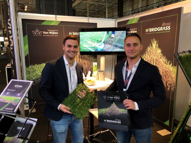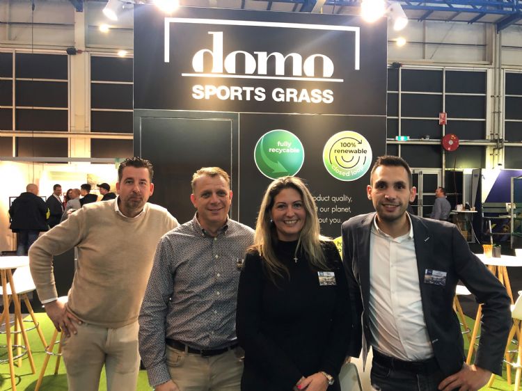 | | Bas Reinds en zijn collega's in de stand van Domo Sports Grass. |