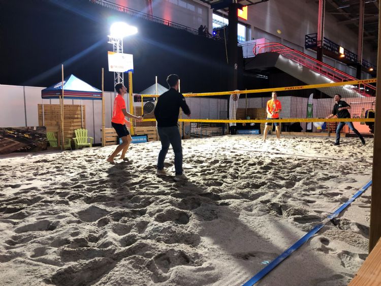 | | Op de beursvloer was ook een beachsportveld aanwezig. |