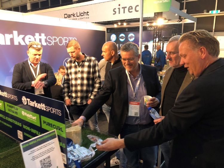 | | Ook in de stand van Tarkett Sports konden bezoekers rekenen op deskundige uitleg over sportvelden. |