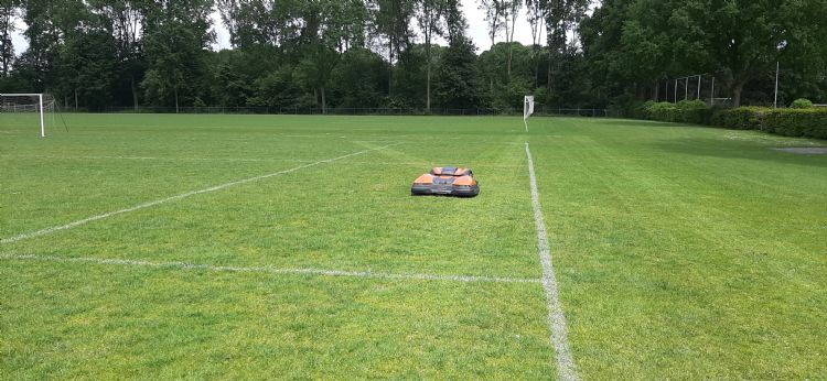 Marc Dingemans is calculator bij Donker Groen en hij begeleidt beide projecten: 'Voor ons vormt dit een uitdaging om het kostendekkend te maken,' vertelt hij. 'Op de Swifterbantse voetbalvelden is een vrijwilligersploeg betrokken bij het veldonderhoud en het terrein eromheen. Ze doen daar ook het onderhoud aan onze robotmaaiers, zoals reinigen en messen vervangen. Op de Drontense velden is het maaien en het onderhoud volledig onze verantwoordelijkheid. De Ceora 546-maairobot heeft een tienmaal zo hoge capaciteit als de robotmaaiers in Swifterbant: 50.000 vierkante meter. Ook biedt hij een mooie innovatie. Naast parallelle banen kan hij namelijk in patronen maaien.' Van die laatste optie maakt Donker Groen zeker gebruik en dat heeft een reden. Dingemanse: 'De machine maait zijn banen van buiten naar binnen. Laat je hem een veld in banen in de breedte maaien, dan slaat hij bijvoorbeeld tussen de doelpalen het gras over. De maaier draait om en gaat vervolgens aan zijn volgende baan verder Het stuk dat niet is gemaaid, probeert hij aan het einde van zijn ronde via de andere kant van het veld te maaien. Datzelfde gebeurt als er bijvoorbeeld twee bankjes of pionnen achter elkaar op een (trainings)veld achterblijven. Maaiend in een blokpatroon pakt hij dat stukje tussen de doelpalen wel mee, omdat hij de ene keer in de lengte en de andere keer in de breedte maait. Je moet overigens goed opletten met de doelnetten. Een neergeklapt doelnet signaleert de machine namelijk, nog, niet voldoende. Maar daarmee ben ik wel aan het experimenteren, met een aanbrengen van een markering. Ik heb ervaren dat je de marges zo ruim mogelijk moet aanhouden bij het uitzetten van de grenzen van het maaiveld. Ook laten we onze robotmaaier het trainingsveld niet maaien. Wanneer daar te veel obstakels als losse trainingsdoelen achterblijven, kunnen we met deze maaimethode geen goed resultaat garanderen.'