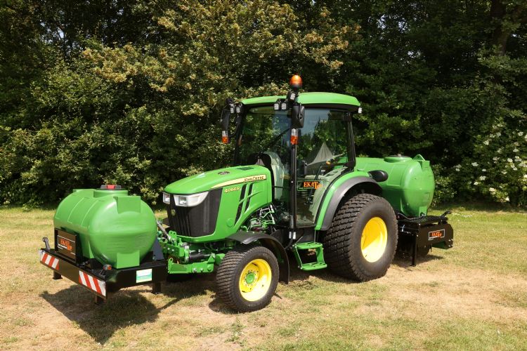 Voor op de tractor zit de tweede grote aanpassing. In deze tank van 300 liter wordt al tijdens het rijden over het veld de volgende oplossing voorgemengd met een eigen circulatiepomp. De oplossing is dus al mooi homogeen, zodat verstoppingen tijdens de verdere werkzaamheden worden voorkomen. In deze tank kan ook de Natusys-wortelstimulator worden toegevoegd. Deze zorgt voor een snelle aanmaak van haarwortels, waardoor de grasmat vlot herstelt en weer snel vastligt.