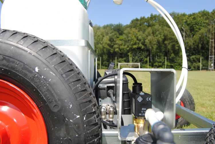 De spil van het concept is belijningsmachine E-Marker. 'Dit is een degelijk toestel waarbij duidelijk niet is bespaard op de kostprijs. Het frame is sterk en voor honderd procent gemaakt uit staal dat door elektrolyse roestvrij is gemaakt. We hebben de ervaring met dit sterke frame opgedaan met de verkoop van de Supermatic GM-10-belijner. Dertig jaar later rijden die belijningsmachines nog altijd prima rond bij de sportverenigingen. Enkel de pomptechniek op de machine is verouderd.' Voor de E-Marker heeft Expo-Line het frame van de oude Supermatic GM-10 herontwikkeld. De wielen van de E-Marker hebben een grote diameter en bevatten kogellagers in zowel de voor- als achterwielen, zodat hij soepel loopt. Het gepatenteerde onderdeel aan de E-Marker is het E-boxensysteem. De membraampomp zit niet ingebouwd of vast gemonteerd in de belijningsmachine, maar zit in een verzegelde transportkoffer, de zogeheten E-box, en bevat snelkoppelingen. Een tweede E-box bevat de accu die de pomp voedt. De derde E-box herbergt reserveonderdelen. 'Elke E-marker bevat drie E-boxen,' vertelt Bogaerts. 'Stel dat de vereniging een probleem heeft met de accu of pomp, dan kunnen wij op afstand zien in welke E-box het probleem zich bevindt. We vragen de klant om de E-box los te koppelen door de drie leidingen los te maken en uit het toestel te schuiven. De klant kan vervolgens de E-box naar ons opsturen, waarna hij een nieuwe E-box ontvangt die hij eenvoudig en snel weer kan aansluiten. Het is dus niet meer nodig om kosten te maken door een monteur langs te laten komen.'