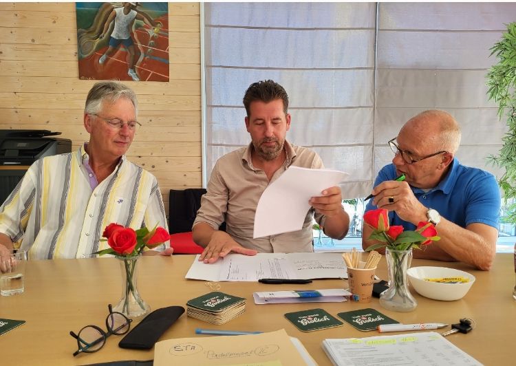 Bas Reinds (midden) ondertekent de afspraken met vertegenwoordigers van tennisvereniging Adegeest.