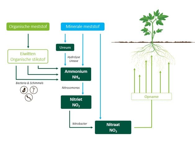 De plant neemt het liefste nitraat op. Een nitraatmeststof is direct en gemakkelijk opneembaar. Meststoffen die meer ammonium en/of nitriet bevatten, komen trager vrij. Hier zijn twee bacteriestammen actief betrokken bij het afbraakproces, namelijk de Nitrosomonas en de Nitrobacter. Deze bacteriën zijn van nature aanwezig in de bodem en zorgen voor de omzet van ammonium en nitriet in nitraat. Indien de meststof ureum bevat, duurt de omzetting nog iets langer. Vandaar dat in traagwerkende meststoffen veelal ureum wordt gebruikt. Organische stikstof kan niet worden opgenomen door de plant. Hier zijn bacteriën en schimmels voor nodig. Deze zorgen voor de omzetting naar ammonium en vervolgens naar nitriet en nitraat.