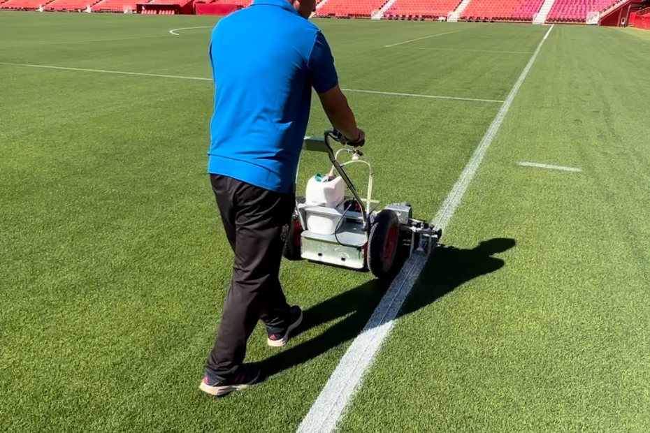 OHL beregent na elke wedstrijd zijn hoofd- en trainingsveld opnieuw, omdat ze het gras snel laten groeien. Na de maaimachine is de E-Marker de meest gebruikte machine. Daarom is Russell blij met de robuustheid van de E-Marker. 'De pomp heeft een hoger vermogen in vergelijking met vorige machines, waardoor die de verf makkelijker door de machine pompt. De kwaliteit is zichtbaar hoog, want de pomp treedt altijd direct in werking en we hebben er nog geen enkele hapering in waargenomen.' Als hij met de belijningsmachine loopt, ervaart hij veel comfort. 'Dat komt doordat in het design is nagedacht over de gewichtsverdeling, waarbij het grootste gewicht rust op de achteras, waardoor je vlot kunt manoeuvreren en je tijdens het lopen het ware gewicht van de machine niet in de gaten hebt.'