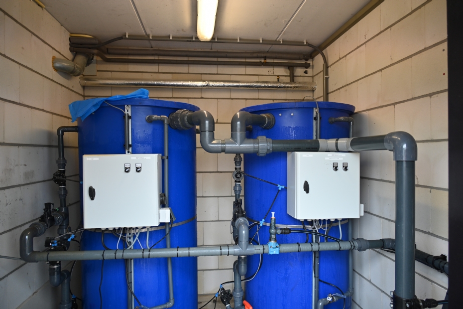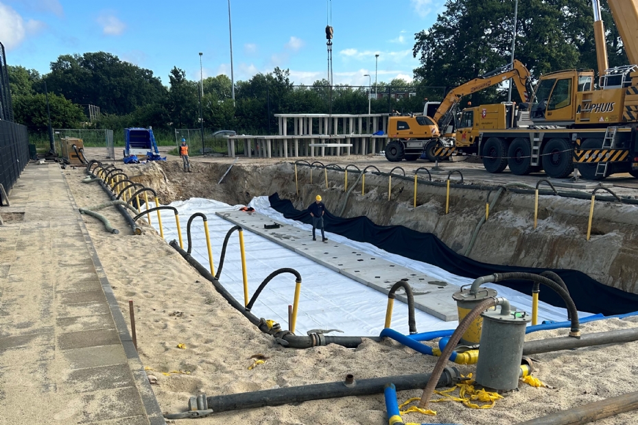 Eerst maar even de techniek. Hoe werkt een Permavoid-systeem? Onder de volledige natuurgrasmat ligt een 85 mm dikke laag kratten. Deze krattenlaag is via een luchtsluis rondom het veld aangesloten op een gigantisch grote ventilator, die is verwerkt in de tribunes. De ventilator kan naar behoefte lucht in en uit het systeem pompen. Het systeem werkt in dat opzicht min of meer hetzelfde als het enige jaren geleden ontwikkelde Draintalent-systeem. Olthuis: 'Toen ik hier in november 2023 kwam, ben ik mij met Cas Olde Avenhuis gaan oriënteren op het systeem dat ons het beste zou passen. Ons advies aan de directie was om voor het Permavoid 85 Sport-systeem te kiezen. Vooral vanwege de gigantisch grote luchtlaag die je onder het complete systeem hebt. Als de krattenlaag volledig gevuld is met water heb je een buffercapaciteit van meer dan 600.000 liter water onder je veld zitten. De krattenlaag, in combinatie met de aangesloten ventilatoren, zorgt ervoor dat je heel goed kunt spelen met het vochtgehalte van de toplaag. Als je onderdruk in het systeem creëert, trek je water uit de toplaag. Als je bovendruk creëert, versterk je de natuurlijke capillaire werking van de grasmat. Het Draintalent systeem doet theoretisch hetzelfde, maar wij hebben daarnaast het voordeel dat we zelfs warme lucht in de krattenlaag kunnen pompen. We hebben nog steeds veldverwarming maar de verwachting is dat we die veel minder nodig hebben. Door de isolerende werking van de luchtlaag onder het veld zal er bijna geen warmte vanuit de veldverwarming naar de ondergrond verdwijnen. Door bij gebruik van de veldverwarming ook nog eens bovendruk op het krattensysteem te zetten stuw je de warme lucht naar boven toe.'