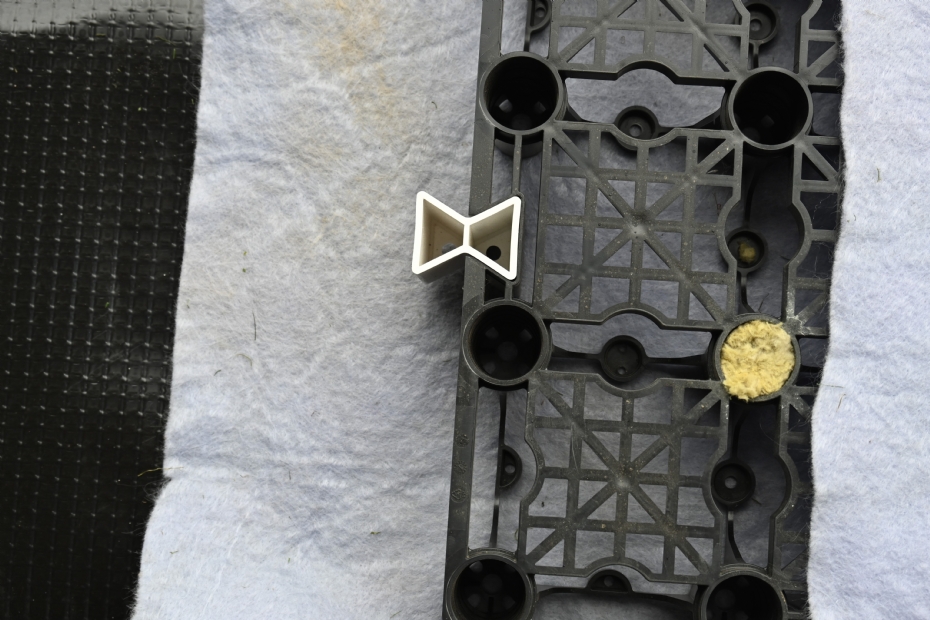 Vlnr is hier de opbouw van de krattenlaag te zien UIterst links het waterdichte folie en dan vervolgens waterverdelend vliesdoek, de krattenlaag met één zichtbare cone en opnieuw het vliesdoek. Daarop komt een zandpakket, de teeltlaag en de graszode