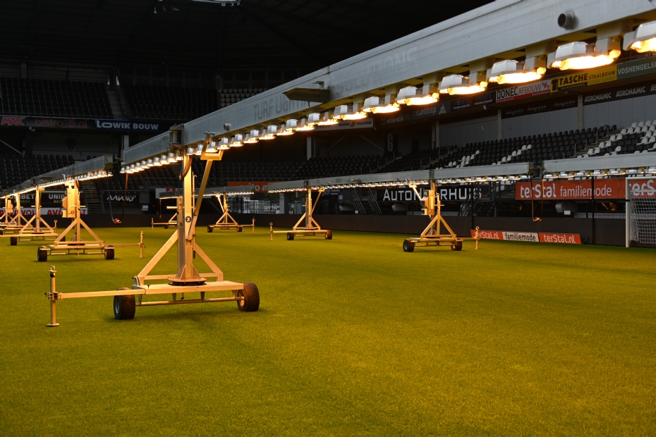 Anno 2024 is het bijna niet meer voor te stellen dat je een kwalitatieve mat neerlegt zonder veldverlichting. In de oorspronkelijke plannen was daar budgettair echter geen rekening mee gehouden. Olthuis: 'De overkapping van het stadion steekt ongeveer gelijk met de rand van het veld. Daarom was veldverlichting hier echt wel een must. We hebben gelukkig een goede deal kunnen maken met SGL door een tweedehands set van vier units aan te schaffen. Het gaat hier om HPS (dus geen LED) units van het Noorse merk TLS. Wat we wel hebben gedaan is rondom het veld aansluitingen maken voor krachtstroom om de SGL units aan te sluiten.