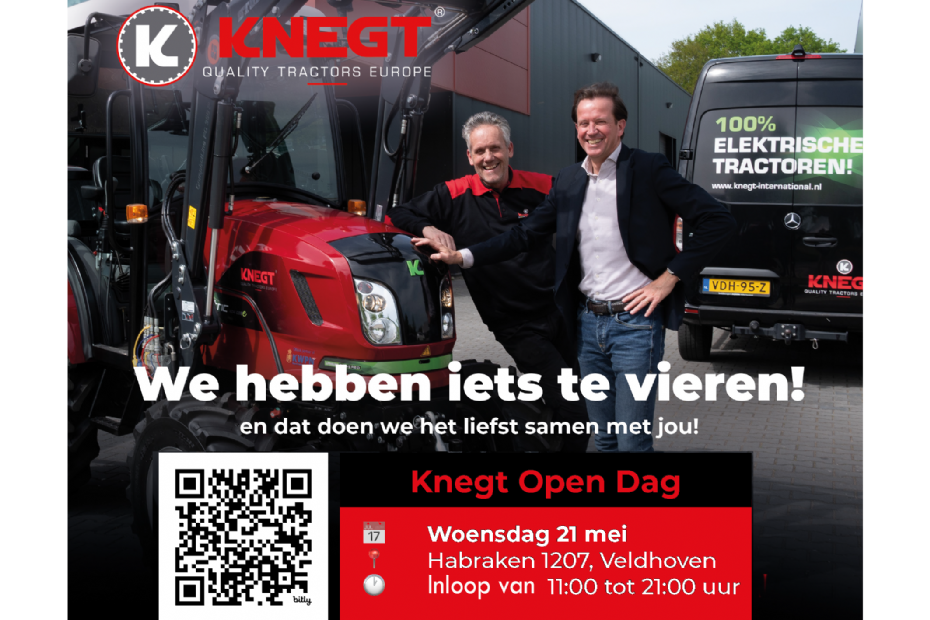 Het prototype van de 65pk-tractor is gereed en wordt momenteel getest om de exacte werktijd te bepalen. Net als de andere modellen is de nieuwe tractor modulair opgebouwd en kan hij worden uitgerust met voorladers, een cabine en verschillende bandentypes. Knegt Tractors organiseert 21 mei 2025 een open dag van 11.00-17-00 uur, om de nieuwe 65pk-tractor te presenteren. Bezoekers krijgen de kans om de tractoren te bekijken, een indruk te krijgen van het productieproces en de mensen achter de machines te ontmoeten. 'We willen een volledig open dag organiseren, waarbij bezoekers een kijkje kunnen nemen. Natuurlijk draait het om de producten, maar we willen ook onze fabriek en assemblagehal laten zien,' aldus Heijmans. Geïnteresseerden kunnen zich aanmelden voor de open dag via de website, social media van Knegt.