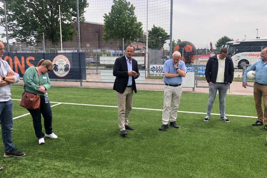 De bus rijdt na de lunch verder richting Montfoort. Joop van Krimpen van Condor Grass staat al op het gezelschap te wachten op het hoofdveld van fusieclub Montfoort SV'19, samen met Nico Kolmsberg van de voetbalclub. Hier ligt inmiddels vier jaar het eerste met hout gevulde kunstgrasvoetbalveld in Europa. Het gaat om hout van de Amerikaanse gele den, dat heel zacht is. In de bus zegt Van der Cammen in zijn voorbeschouwing: 'Het vergruist niet en drijft niet, zoals de eerste generatie kurk. Het houdt een beetje vocht vast en hoeft bijna niet aangevuld te worden. Je moet de houten infill wel goed los houden in verband met de grip en waterdoorlatendheid. Clubs zijn heel tevreden over deze natuurlijke infill.' Dat laatste bevestigt Kolmsberg, die zijn velden goed onderhoudt. Van Krimpen vertelt in zijn toelichting onder andere dat het materiaal niet verteert en ook geen splinters veroorzaakt, zoals sommigen denken bij het horen van het woord hout. Hij roemt de veerkracht van het materiaal. Hij vertelt dat zijn bedrijf een aantal velden met de productnaam BrockFill op de sportproductenlijst heeft staan, waarbij de shockpads het verschil maken. Er staat ook een 'houten' rugbyveld op deze lijst. Ook dit keer testen de deelnemers het veld door zelf met ballen aan de slag te gaan. 'Ik weet nog steeds niet wat ik moet kiezen', verzucht iemand.