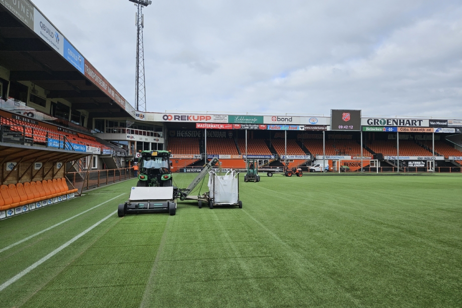 De zoektocht naar een hoofdaannemer resulteerde in de keuze voor K. Groenenboom BV uit het naburige Barendrecht. Een relatief onbekend bedrijf in het wereldje, maar een prima keuze, volgens Kok. 'Het is een echt familiebedrijf en dat past helemaal bij deze club. Er was direct een goede klik. In de aanbesteding was een voorwaarde dat de partij die het veld aanlegt, het ook onderhoudt. Zij zitten op maar vijftien minuten afstand van het stadion en dat is een groot voordeel.' Inmiddels zijn de juiste machines voor het onderhoud aangeschaft en tijdens de ingrow van het stadionveld kon mede dankzij de inzet van een maairobot het gras dagelijks gemaaid worden.