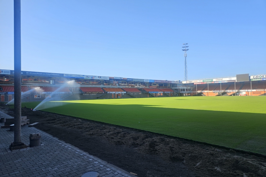Mölder Sportveldberegening leverde de installatie voor de veldberegening en Sports Pitch de veldverwarming. De oude pompinstallatie zat tegen de oude tribune aan en moest door de bouw van een nieuwe tribune aangepast worden. Muis: 'Mölder heeft hierin heel goed meegedacht en de situatie opgelost door de bron te verlagen en alle oude leidingen te vervangen. Een groot compliment hiervoor. Ook de samenwerking met alle andere partijen verliep prima. De uitdaging zat dan ook niet in het nieuwe stadionveld. Dat was gewoon de lasagne opbouwen. Een grotere uitdaging zijn het onderhoud en het vinden van een permanent trainingscomplex.' Voorlopig trainen de profspelers op de velden van de amateurs van Waterloo in IJmuiden. 'Het onderhoud moest hierdoor natuurlijk wel opgeplust worden', besluit Muis.
