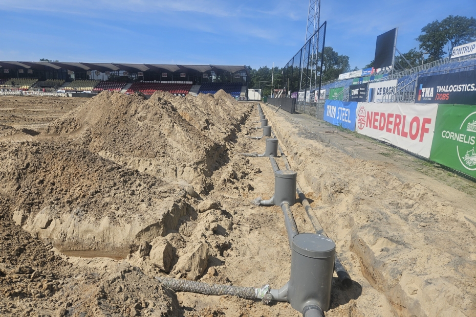 Toen Excelsior na het afgelopen voetbalseizoen rechtstreekse promotie naar de Eredivisie afdwong, wist de club dat het kunstgrasveld in het Van Donge & De Roo Stadion plaats moest maken voor het verplichte natuurgras. Om deze 1,5 miljoen euro kostende klus te klaren is een bouwteam samengesteld. Het bedrijf Grasmeesters was betrokken als onafhankelijke partij die veel ervaring en verstand heeft met en van gras om dit hele traject te coördineren en te begeleiden. 'Het voordeel van die directe promotie was dat wij al in mei konden starten', vertelt Hans Kok van Grasmeesters. Half juli ligt het stadionveld er dan ook al prima bij en zou er in principe al op gevoetbald kunnen worden. Bijkomend voordeel was dat Excelsior al in juli 2024 was gestart met de voorbereiding aangezien het los van wel of geen promotie de ombouw wilde realiseren.