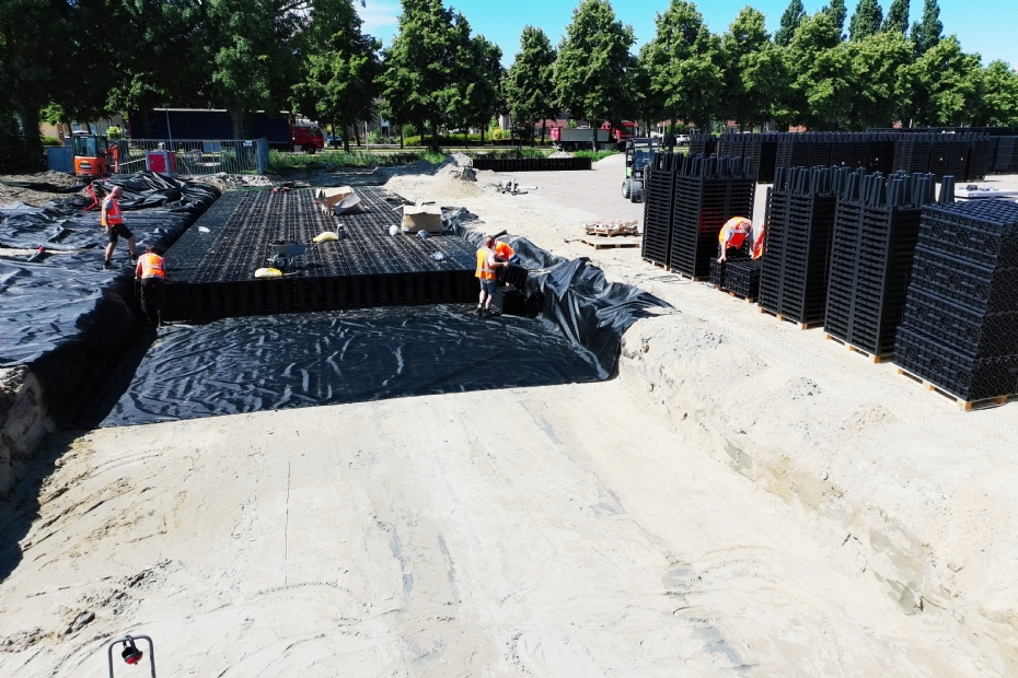 Het opgevangen water wordt niet benut voor beregening van de velden, want dat is niet meer nodig. Alle nieuwe velden zijn namelijk van kunstgras. De bestaande beregeningsinstallaties op het sportpark zijn dan ook verwijderd. 'Als Finovi hebben we al vele waterbergende velden gerealiseerd. Voornamelijk zogenaamde WABER-systemen, die bestaan uit een pakket grof gesteente met grote holle ruimten, maar we hebben ook een aantal velden voorzien van een krattensysteem. Een krattenstraat van 8 meter breed en 160 meter lang midden op een sportpark, zoals hier in Waddinxveen, hadden we echter nog niet eerder gerealiseerd.'