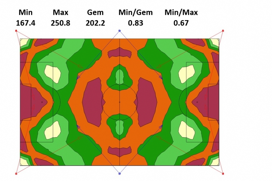 De ontwerpsoftware kan meestal een met verschillende kleuren gevuld isolijnendiagram maken. Dit geeft een mooi visueel beeld van de verdeling van het licht over het veld. Hieronder volgen enkele voorbeelden. Aangezien het spel het meest in het midden van het veld plaatsvindt, hebben we de donkerste plekken liever aan de rand van het veld dan in het midden. Idealiter liggen de donkerste en lichtste plekken niet vlak naast elkaar (dat kan eventueel in een gradiënt uitgedrukt worden). Met een gevuld isolijnendiagram kunnen dergelijke aspecten visueel beoordeeld worden. De kwaliteit van de verlichting is moeilijk in een paar getallen te vangen. Een gevuld isolijnendiagram geeft een genuanceerder beeld dan alleen Emin : Egem of Emin : Emax.