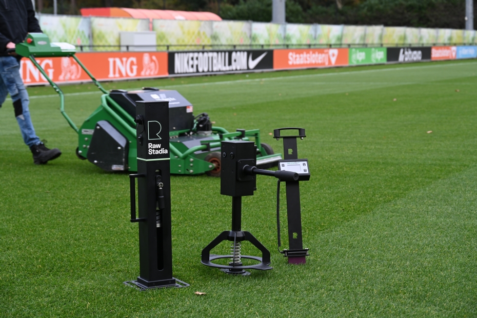 Op de KNVB Campus in Zeist liggen drie hybride trainingsvelden die worden gebruikt door alle nationale teams. De velden worden intensief bespeeld en moeten week in, week uit aan de hoogste eisen voldoen. Dat lukt alleen met precisie. Ed Hubers meet de velden wekelijks met de meetapparatuur van Raw Stadia. Op achttien vaste meetpunten per veld registreert hij waarden voor hardheid, schokabsorptie, oppervlakvervorming en energierestitutie. Ook de rotatie en rotatiestijfheid van de toplaag worden gemeten, net als de diepte van de noppen, het vochtgehalte, de temperatuur en de grashoogte. Zelfs de veerkracht van het oppervlak wordt meegenomen. 'Wat de meeste mensen zien, is een groen veld,' zegt Hubers. 'Maar achter dat groen schuilt een hele database aan informatie. Naast deze metingen gebruiken we de data van twee weerstations, waaronder temperatuur en hoeveelheid neerslag. Daarnaast zijn er sensoren in het veld. Vaste sensoren in de bodem van het veld meten de bodemtemperatuur. Dit is belangrijk omdat de velden over veldverwarming beschikken. Losse sensoren gebruiken we naast temperatuur ook voor bodemvocht. We weten precies hoe een veld reageert op belasting, neerslag of onderhoud.'