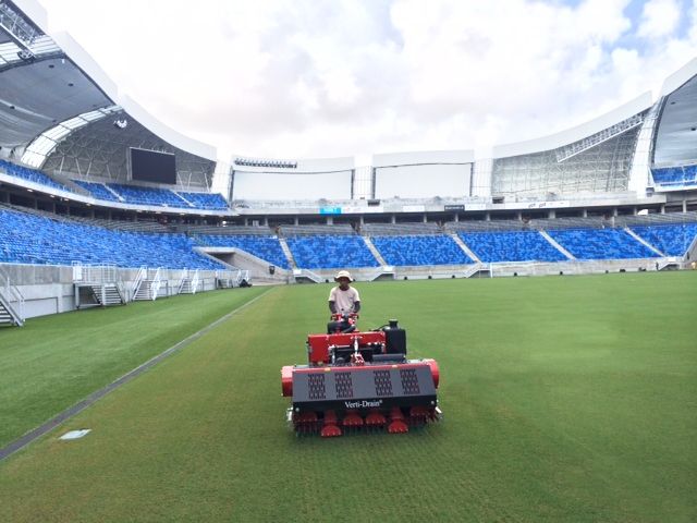 Een paar dagen voor de openingswedstrijd is de Carrier met Verti-Drain ingezet in het Corinthians stadion in Sao Paulo op hun Desso Grassmastermat, omdat deze matten de neiging hebben sneller hard te worden en de technische Brazilianen er baat bij hebben dat de mat strak en soepel is en extra kort gemaaid. Hier werd gisteren, donderdag 12 juni,de openingswedstrijd gespeeld tussen Brazilië en Kroatië. Heel erg swingend was het allemaal nog niet, het leek erop dat de Braziliaanse spelers meer last van stres hadden dan het gras.