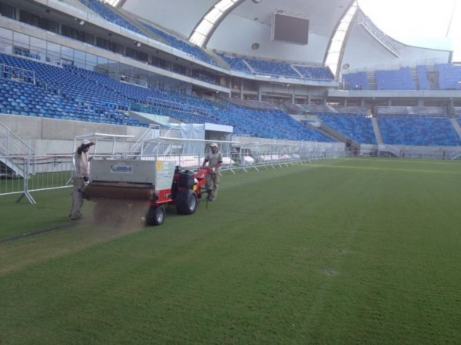 Nu het WK van start is gegaan, is het zaak om na de wedstrijden de velden weer snel in conditie te krijgen voor de volgende wedstrijd. Op het WK in Brazilië worden zelfrijdende onderhoudsmachines gebruikt, zodat de bodemdruk beperkt blijft. In de 12 stadions zijn op de velden tijdens het toernooi, tractoren zijn namelijk niet toegestaan, teneinde het risico van afdrukken in de grasmat te voorkomen.